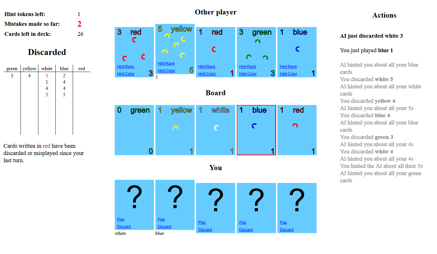 On the left you can see how many hint tokens are currently available, how many mistakes have been made so far and how many cards are left in the deck. If you reach 2 mistakes, as in the picture above, the number will turn red and be shown in bold to draw your attention to that fact. In the center you see the AI player's hand on top, the board in the center and a representation of your hand (which you can't see) on the bottom. To play or discard one of your own cards, click the link on that card to do so. To hint the AI about all their cards of a particular color or rank, click the link on any card that matches that color or rank. For example, if you click the "hint color" link on the yellow 4, they will be hinted about all their yellow cards. Note that the "Hint Color" and "Hint Rank" links will not be shown when no hint tokens are available. Underneath each card in your hand you can see what you have been told about that card in the past. The same goes for the cards in the AI's hand. Note that you will not be reminded of information that you can infer from a hint. In particular, if you are told that some of your cards are 1s, they will be marked as such, but the other cards will not be marked as "not 1s". On the right side of the screen, finally, you will see the last actions that happened, with the newest action on top of the list. The cards that were affected by the last two actions (your last action and the last action the AI performed) will also be highlighted in red. For hints that were given this will appear as a red frame around the card or cards in a player's hand. For a card that was successfully played a red frame will be drawn around the stack on the board on which the card was played. Otherwise, if a card is unsuccessfully played or discarded, that card will be highlighted in red in the list of cards in the trash. When you click "Continue" you and the AI will immediately be dealt cards. When you click "Start Game" the AI will take the first turn, and then it is your turn. |
